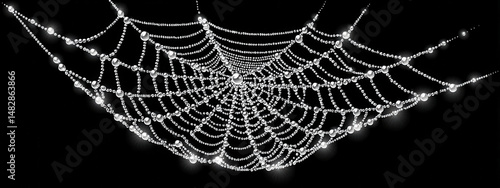 Elegant spiderweb adorned with glistening dewdrops against a black background
