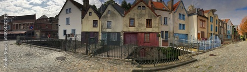 Panoramic street view of empty cobblestone alley with historic buildings