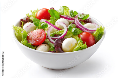 Fresh vegetable salad in a white bowl with mozzarella and onions