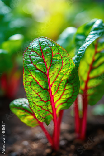 Close-up of vibrant green chard leaf with red veins in sunlight