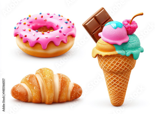 Colorful illustrations of sweet treats including donut, ice cream, and croissant