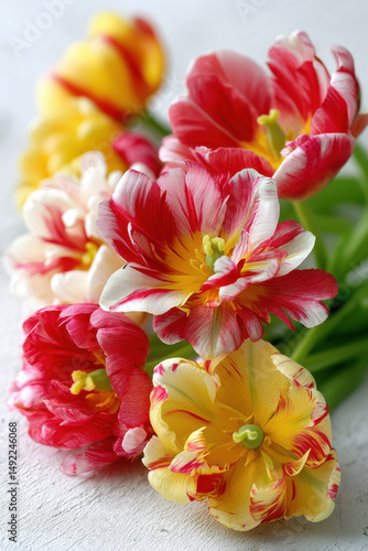 Close-up of vibrant red and yellow parrot tulips in bloom