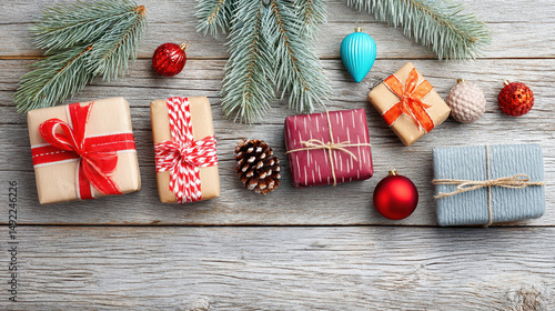 Festive Christmas gift boxes and pine cones arranged with evergreen branches and twine