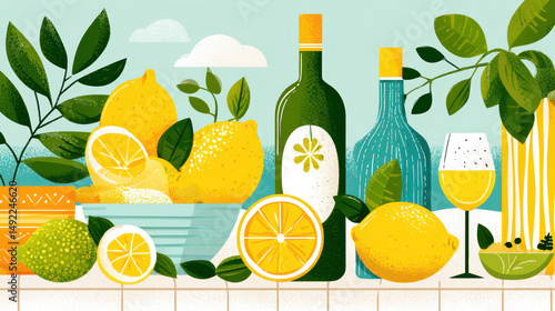 Illustration featuring lemons, wine bottles, and leaves in a vibrant setting