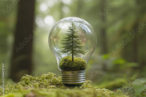 Tree inside a light bulb symbolizing eco-friendly energy in natural surroundings.