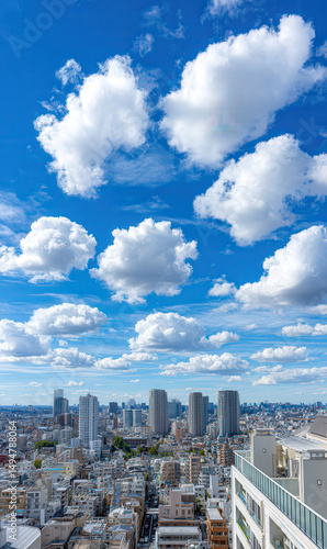 Bright clouds over Tokyo cityscape under a vibrant blue sky