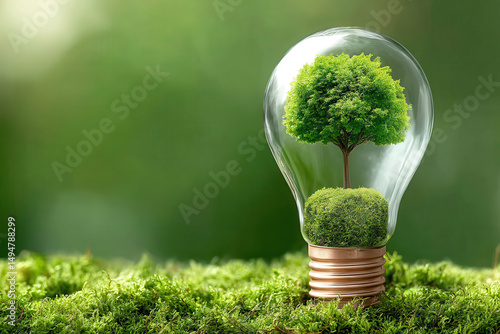 Sustainable energy concept with tree inside light bulb resting on moss