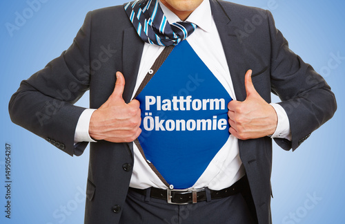Geschäftsmann zeigt Schriftzug „Plattform Ökonomie“ unter Anzug