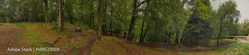 Panoramic view of a serene forest landscape with trees and a leafy ground