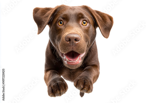 Excited chocolate Labrador retriever leaping joyously against a white background