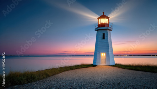 Lighthouse glowing at night surrounded by a serene coastal landscape