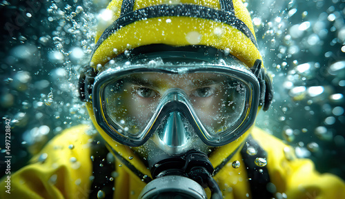 Close-up of an underwater diver wearing a yellow suit and protective mask