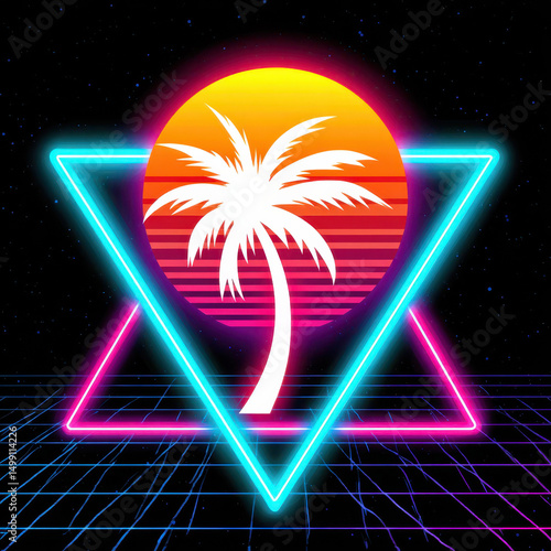 Retro styled palm tree silhouette with vibrant sunset and geometric neon highlights