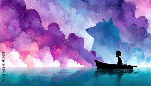 Silhouetted boy rowing under vivid clouds with a wolf figure