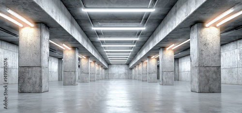 Empty industrial underground space with concrete pillars and fluorescent lighting