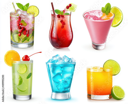 Colorful assortment of vibrant mixed cocktails with garnishes on a white background