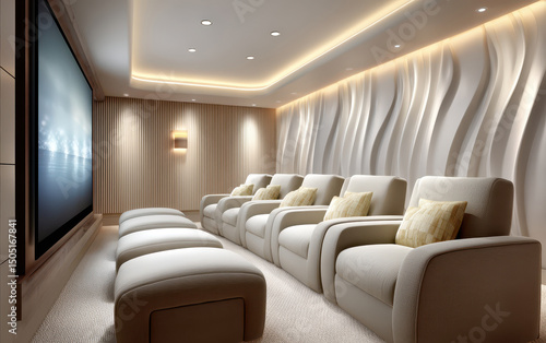 Cozy little movie theater as interior design illustration with white empty screen for mock-up for poster design (Generative AI)