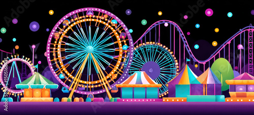 Colorful amusement park with Ferris wheel and roller coaster at night