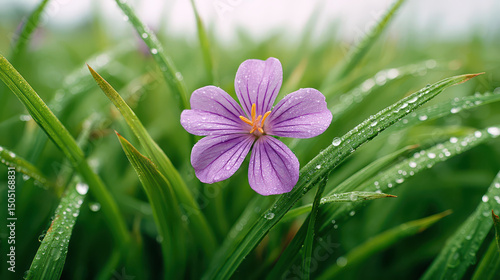 Purple flower amidst fresh green grass covered with morning dew in sunlight