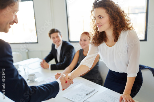 Silhouetten von Geschäftsleuten vor Collage aus vielen Mitarbeiter Portraits