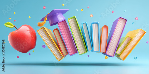 Colorful books, pencils, and an apple with a graduation hat on blue