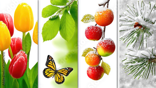 Seasonal representation with tulips, butterfly, apples, and snowy pine branches