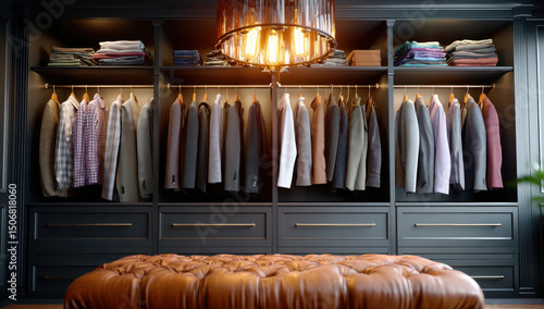 Elegant men's wardrobe featuring suits, shirts, and stylish casual attire