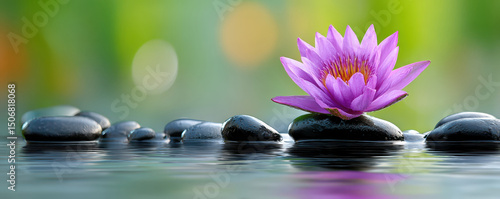 Purple lotus flower on stones with tranquil water and vibrant background