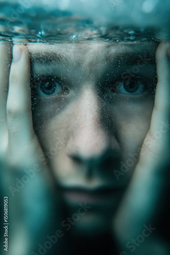 Close-up shot of a French male fashion model with striking blue eyes and wavy hair