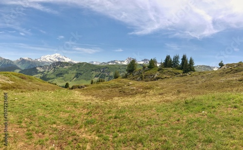 Wide panorama of alpine landscape with snowy mountains and clear sky