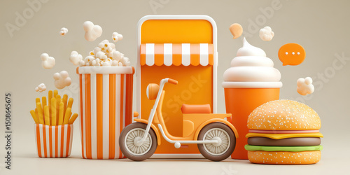 Colorful 3D fast food icons including burgers, fries, and soda drinks