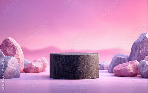 Dark stone pedestal surrounded by rocks on a pink ethereal backdrop