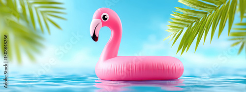 Pink inflatable flamingo floating on calm water under tropical palm trees