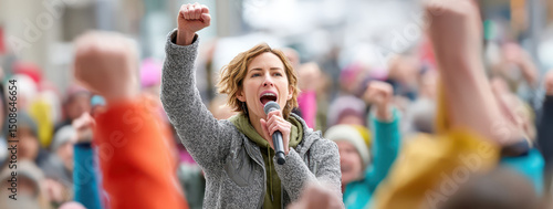 Confident woman addressing a large outdoor crowd showcasing empowerment and leadership