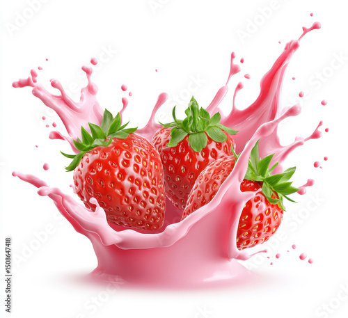 Fresh strawberries splashing in vibrant pink milk against white background
