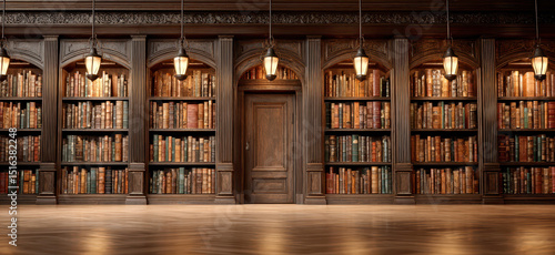 Elegant vintage library interior with towering bookshelves and classic furniture