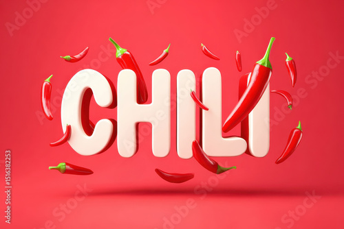Spicy chili typography with scattered red and green peppers on vibrant backdrop