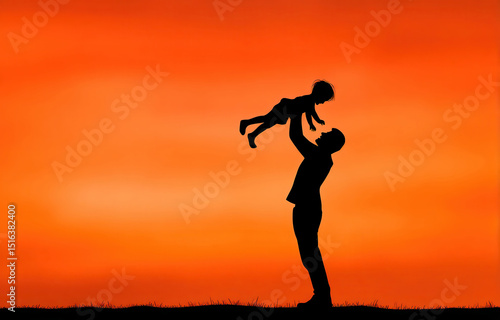 Silhouette of a man lifting a child against a vibrant sunset sky