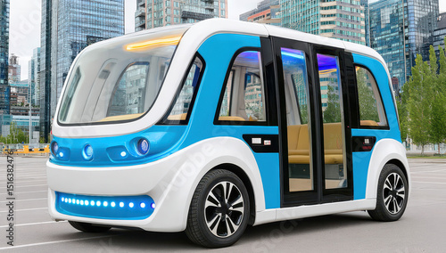 Modern self-driving blue and white van parked in a city environment