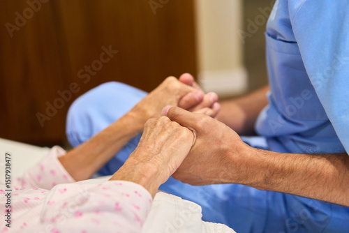 Nurse attending to resting senior patient in medical rehabilitation facility