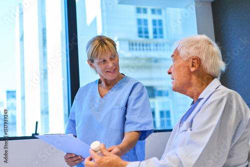 Nurse and elderly patient sharing discussion at rehabilitation facility