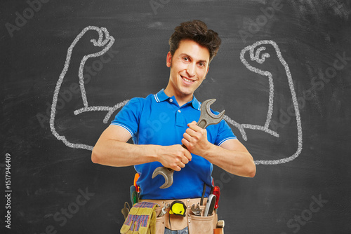 Junger Mann steht halb im Anzug und halb im Blaumann vor Tafel mit Muskel Armen