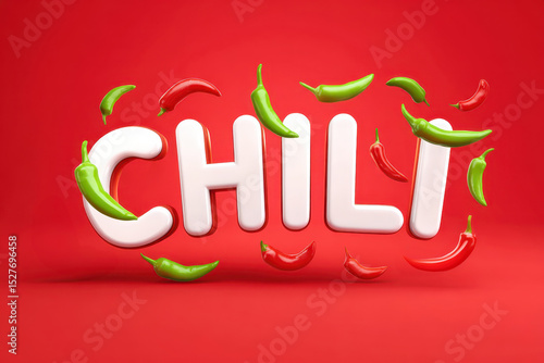 Chili peppers flying around the word chili in bold 3D letters