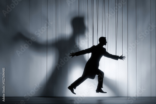 Man escaping strings with dramatic shadow play and conceptual twilight atmosphere