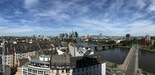 Panoramic cityscape view with modern skyline and river under cloudy sky