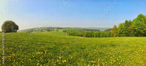Panoramic view of a countryside meadow with yellow flowers and trees