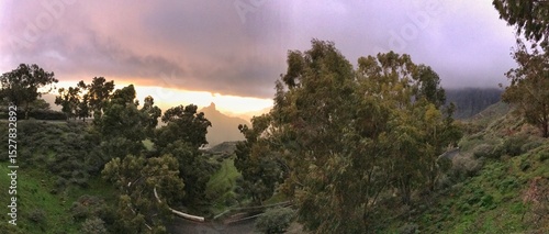 Panoramic view of lush mountains under a dynamic cloud-filled blue sky