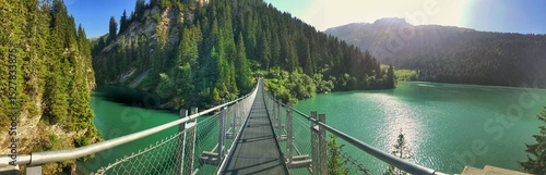 Hanging bridge over green lake surrounded by forested mountains, panoramic view