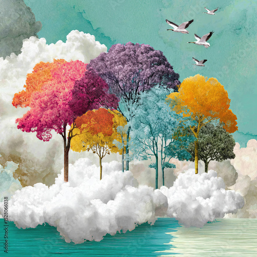 Vibrant surreal landscape with colorful trees floating on clouds over water