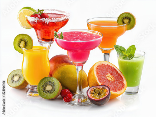 Colorful assortment of mixed fruit and drinks in elegant glasses